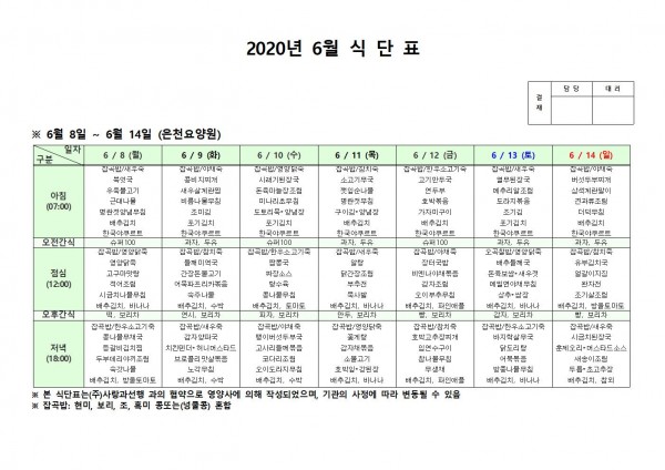 6월 둘째주 식단표 페이지 정보 작성자 은천노인복지회 작성일20-06-15 12:49 조회170,543회 댓글0건 관련링크 이전글 다음글 목록 답변 본문 ㅣ; 이전글 다음글 목록 답변