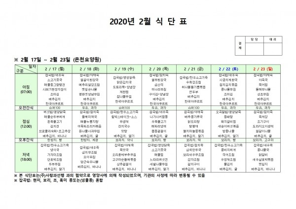 2월 셋째주 식단표 페이지 정보 작성자 은천노인복지회 작성일20-02-24 11:02 조회181,555회 댓글0건 관련링크 이전글 다음글 목록 답변 본문 . 이전글 다음글 목록 답변