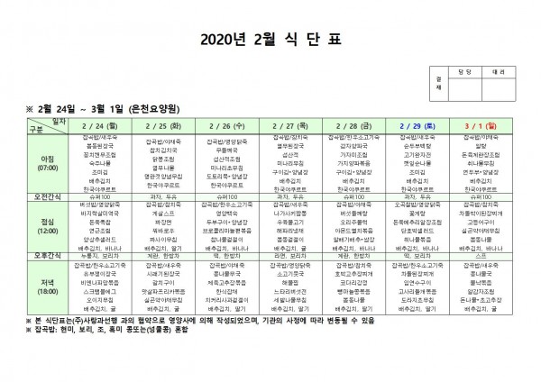 2월 넷째주 식단표 페이지 정보 작성자 은천노인복지회 작성일20-03-02 13:41 조회180,399회 댓글0건 관련링크 이전글 다음글 목록 답변 본문 2월 넷째주 식단표입니다 이전글 다음글 목록 답변