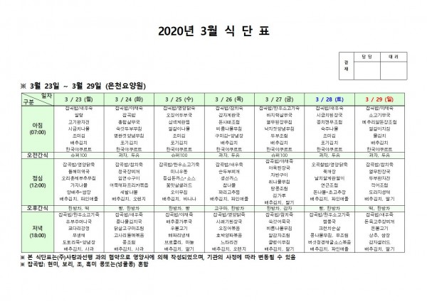 3월 넷째주 식단표 페이지 정보 작성자 은천노인복지회 작성일20-03-31 16:09 조회180,322회 댓글0건 관련링크 이전글 다음글 목록 답변 본문 . 이전글 다음글 목록 답변