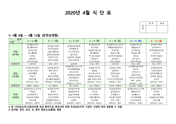 4월 첫째주 식단표 페이지 정보 작성자 은천노인복지회 작성일20-04-13 15:04 조회178,948회 댓글0건 관련링크 이전글 다음글 목록 답변 본문 . 이전글 다음글 목록 답변