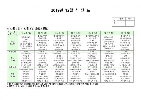 12월 첫째주 식단표 페이지 정보 작성자 은천노인복지회 작성일19-12-11 09:51 조회189,840회 댓글0건 관련링크 이전글 다음글 목록 답변 본문 12월 첫째주 식단표 이전글 다음글 목록 답변