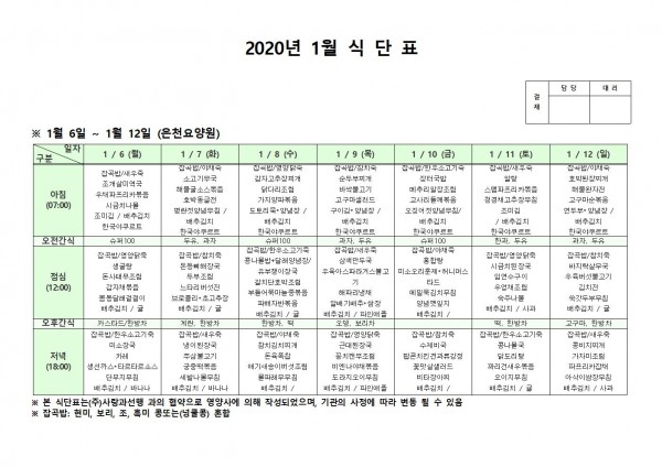 1월 첫째주 식단표 페이지 정보 작성자 은천노인복지회 작성일20-01-13 10:55 조회187,467회 댓글0건 관련링크 이전글 다음글 목록 답변 본문 1월 첫째주 식단표입니다. 이전글 다음글 목록 답변