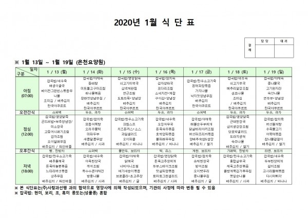 1월 둘째주 식단표 페이지 정보 작성자 은천노인복지회 작성일20-01-21 11:11 조회186,918회 댓글0건 관련링크 이전글 다음글 목록 답변 본문 1월 둘째주 식단표입니다 이전글 다음글 목록 답변