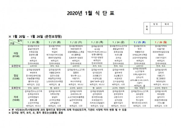 1월 셋째주 식단표 페이지 정보 작성자 은천노인복지회 작성일20-01-28 14:25 조회185,939회 댓글0건 관련링크 이전글 다음글 목록 답변 본문 1월 셋째주 식단표입니다. 이전글 다음글 목록 답변