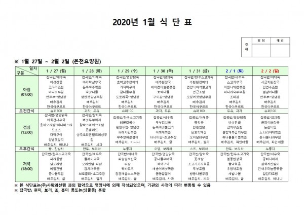 1월 넷째주 식단표 페이지 정보 작성자 은천노인복지회 작성일20-02-04 09:37 조회184,604회 댓글0건 관련링크 이전글 다음글 목록 답변 본문 1월 넷째주 식단표입니다. 이전글 다음글 목록 답변