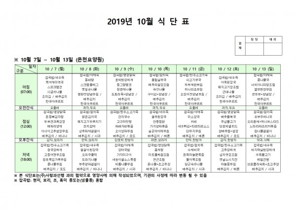 10월 둘째주 식단표 페이지 정보 작성자 은천노인복지회 작성일19-10-14 14:26 조회194,919회 댓글0건 관련링크 이전글 다음글 목록 답변 본문 10월 둘째주 식단표 이전글 다음글 목록 답변