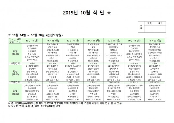 10월 셋째주 식단표 페이지 정보 작성자 은천노인복지회 작성일19-10-21 15:50 조회193,712회 댓글0건 관련링크 이전글 다음글 목록 답변 본문 10월 셋째주 식단표 이전글 다음글 목록 답변