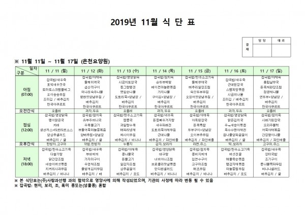 11월 둘째주 식단표 페이지 정보 작성자 은천노인복지회 작성일19-11-18 14:46 조회193,511회 댓글0건 관련링크 이전글 다음글 목록 답변 본문 11월 둘째주 식단표 이전글 다음글 목록 답변
