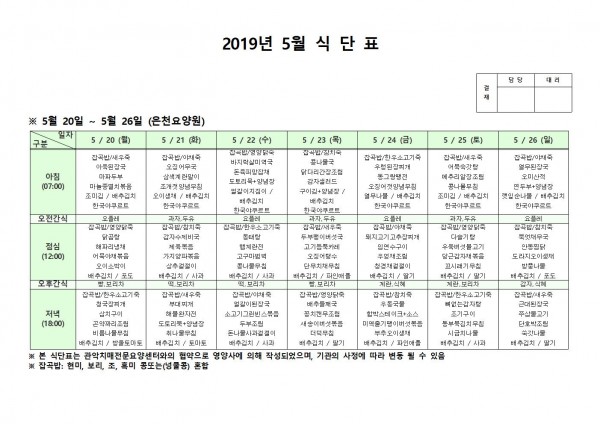 5월 셋째주 식단표 페이지 정보 작성자 은천노인복지회 작성일19-05-27 14:07 조회203,331회 댓글0건 관련링크 이전글 다음글 목록 답변 본문 5월 셋째주 식단표 이전글 다음글 목록 답변