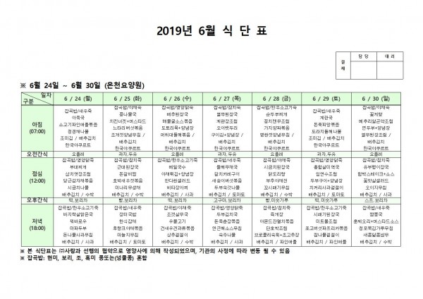 6월 넷째주 식단표 페이지 정보 작성자 은천노인복지회 작성일19-07-02 11:48 조회200,950회 댓글0건 관련링크 이전글 다음글 목록 답변 본문 6월 넷째주 식단표 이전글 다음글 목록 답변