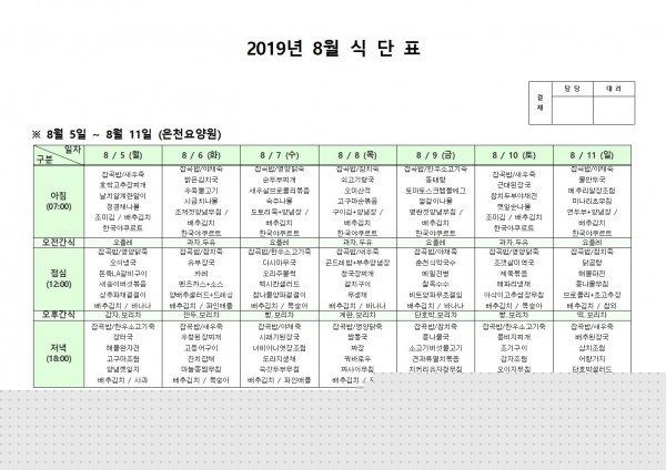 8월 둘째주 식단표 페이지 정보 작성자 은천노인복지회 작성일19-08-19 15:26 조회197,919회 댓글0건 관련링크 이전글 다음글 목록 답변 본문 8월 둘째주 식단표 이전글 다음글 목록 답변