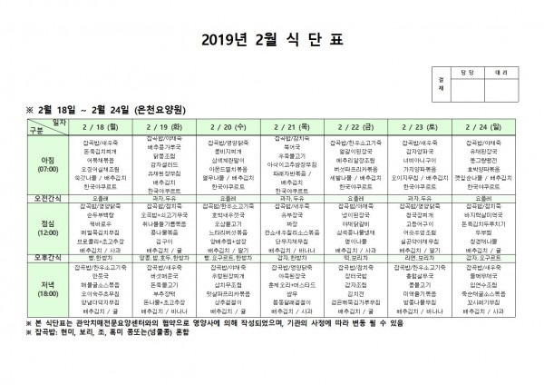 2월 셋째주 식단표 페이지 정보 작성자 은천노인복지회 작성일19-02-28 15:44 조회207,581회 댓글0건 관련링크 이전글 다음글 목록 답변 본문 2월 셋째주 식단표 이전글 다음글 목록 답변