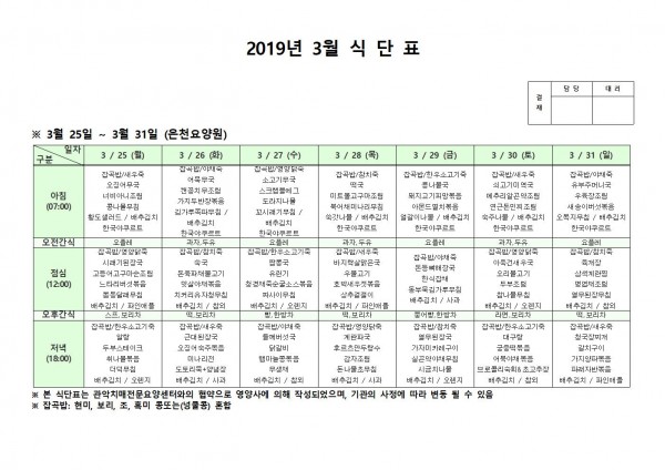 3월 넷째주 식단표 페이지 정보 작성자 은천노인복지회 작성일19-04-01 11:06 조회205,858회 댓글0건 관련링크 이전글 다음글 목록 답변 본문 3월 넷째주 식단표 이전글 다음글 목록 답변