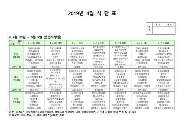 4월 다섯째주 식단표 페이지 정보 작성자 은천노인복지회 작성일19-05-07 14:13 조회205,735회 댓글0건 관련링크 이전글 다음글 목록 답변 본문 4월 다섯째주 식단표 이전글 다음글 목록 답변