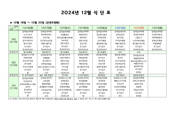 12월 셋째주 식단표 페이지 정보 작성자 은천노인복지회 작성일24-12-13 09:36 조회20,283회 댓글0건 관련링크 이전글 다음글 목록 답변 본문 . 이전글 다음글 목록 답변