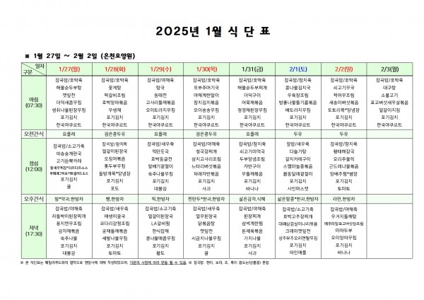 1월 다섯째주 식단표 페이지 정보 작성자 은천노인복지회 작성일25-01-24 10:07 조회16,976회 댓글0건 관련링크 이전글 다음글 목록 답변 본문 . 이전글 다음글 목록 답변