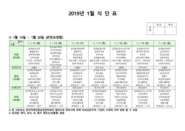 1월 둘째주 식단표 페이지 정보 작성자 은천노인복지회 작성일19-01-22 13:31 조회209,538회 댓글0건 관련링크 이전글 다음글 목록 답변 본문 1월 둘째주 식단표 이전글 다음글 목록 답변