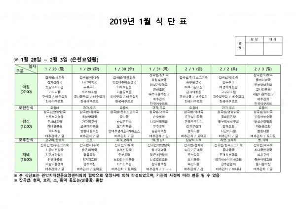 1월 넷째주 식단표 페이지 정보 작성자 은천노인복지회 작성일19-02-13 17:29 조회208,181회 댓글0건 관련링크 이전글 다음글 목록 답변 본문 1월 넷째주 식단표 이전글 다음글 목록 답변