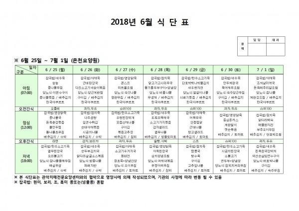 6월 다섯째주 식단표 페이지 정보 작성자 은천노인복지회 작성일18-07-09 16:45 조회212,125회 댓글0건 관련링크 이전글 다음글 목록 답변 본문 6월 다섯째주 식단표 이전글 다음글 목록 답변