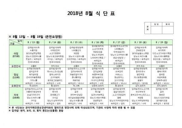 8월 셋째주 식단표 페이지 정보 작성자 은천노인복지회 작성일18-08-27 09:47 조회207,945회 댓글0건 관련링크 이전글 다음글 목록 답변 본문 8월 셋째주 식단표 이전글 다음글 목록 답변