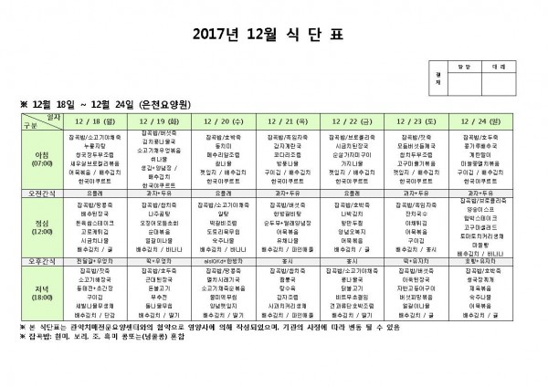 12월 넷째주 식단표 페이지 정보 작성자 은천노인복지회 작성일17-12-18 16:58 조회192,658회 댓글0건 관련링크 이전글 다음글 목록 답변 본문 12월 넷째주 식단표 이전글 다음글 목록 답변