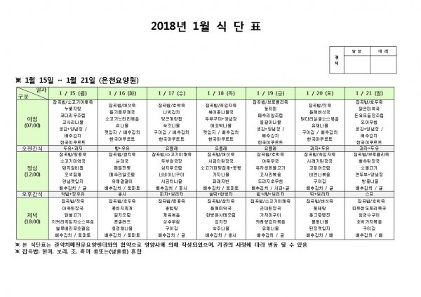 1월 셋째주 식단표 페이지 정보 작성자 은천노인복지회 작성일18-01-17 15:16 조회195,026회 댓글0건 관련링크 이전글 다음글 목록 답변 본문 1월 셋째주 식단표 이전글 다음글 목록 답변