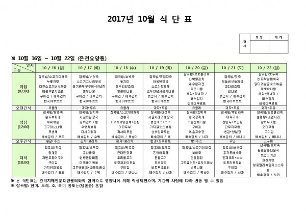 10월 셋째주 식단표 페이지 정보 작성자 은천노인복지회 작성일17-10-17 17:39 조회186,043회 댓글0건 관련링크 이전글 다음글 목록 답변 본문 10월 셋째주 식단표 이전글 다음글 목록 답변