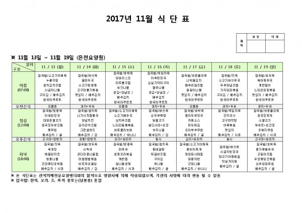 11월 셋째주 식단표 페이지 정보 작성자 은천노인복지회 작성일17-11-13 17:29 조회187,462회 댓글0건 관련링크 이전글 다음글 목록 답변 본문 11월 셋째주 식단표 이전글 다음글 목록 답변