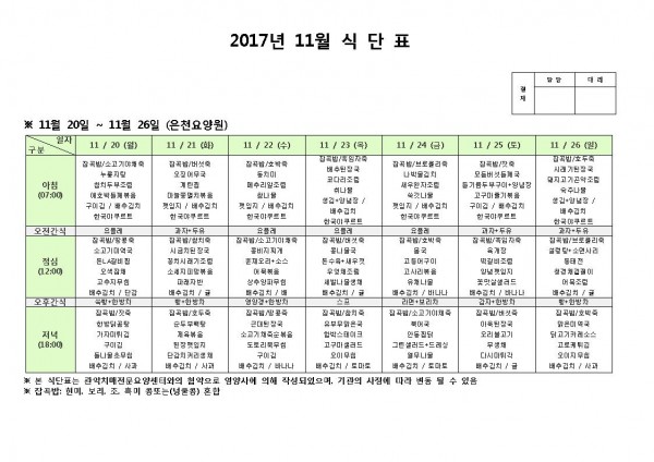 11월 넷째주 식단표 페이지 정보 작성자 은천노인복지회 작성일17-11-20 11:22 조회189,039회 댓글0건 관련링크 이전글 다음글 목록 답변 본문 11월 넷째주 식단표 이전글 다음글 목록 답변