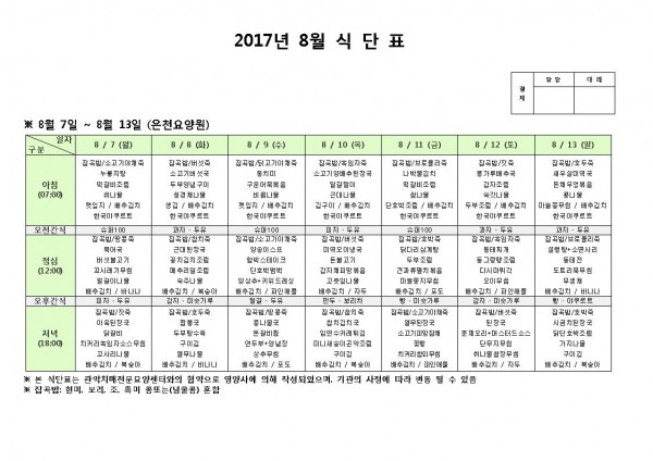8월 둘째주 식단표 페이지 정보 작성자 은천노인복지회 작성일17-08-07 09:46 조회182,947회 댓글0건 관련링크 이전글 다음글 목록 답변 본문 8월 둘째주 식단표 이전글 다음글 목록 답변