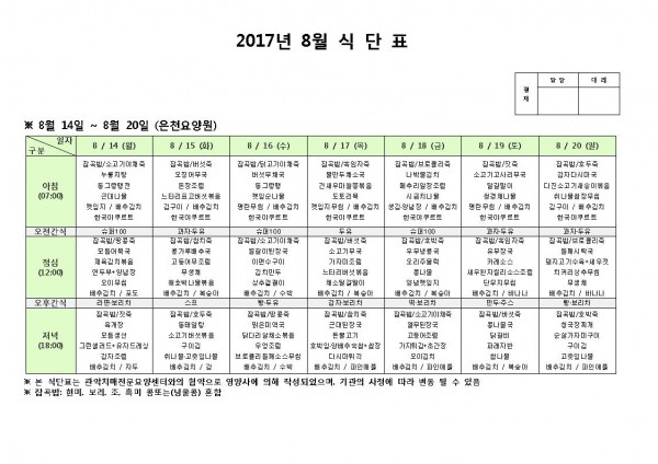 8월 셋째주 식단표 페이지 정보 작성자 은천노인복지회 작성일17-08-14 14:05 조회182,281회 댓글0건 관련링크 이전글 다음글 목록 답변 본문 8월 셋째주 식단표 이전글 다음글 목록 답변