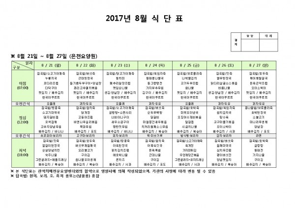 8월 넷째주 식단표 페이지 정보 작성자 은천노인복지회 작성일17-08-21 10:51 조회182,416회 댓글0건 관련링크 이전글 다음글 목록 답변 본문 8월 넷째주 식단표 이전글 다음글 목록 답변