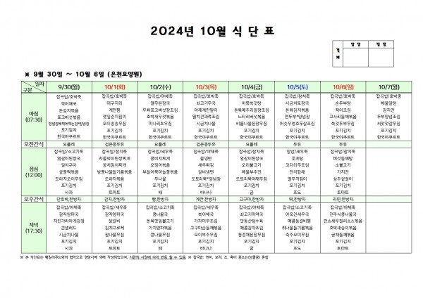 10월 첫째주 식단표 페이지 정보 작성자 은천노인복지회 작성일24-09-27 17:45 조회22,571회 댓글0건 관련링크 이전글 다음글 목록 답변 본문 . 이전글 다음글 목록 답변