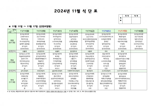 11월 둘째주 식단표 페이지 정보 작성자 은천노인복지회 작성일24-11-07 16:50 조회21,820회 댓글0건 관련링크 이전글 다음글 목록 답변 본문 . 이전글 다음글 목록 답변