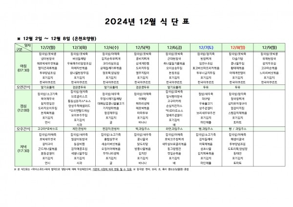 12월 첫째주 식단표 페이지 정보 작성자 은천노인복지회 작성일24-11-29 16:53 조회21,049회 댓글0건 관련링크 이전글 다음글 목록 답변 본문 . 이전글 다음글 목록 답변