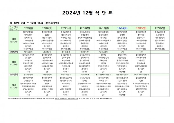 12월 둘째주 식단표 페이지 정보 작성자 은천노인복지회 작성일24-12-06 09:42 조회20,991회 댓글0건 관련링크 이전글 다음글 목록 답변 본문 . 이전글 다음글 목록 답변