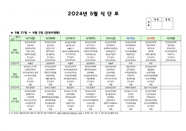5월 다섯째주 식단표 페이지 정보 작성자 은천노인복지회 작성일24-05-24 16:18 조회27,992회 댓글0건 관련링크 이전글 다음글 목록 답변 본문 . 이전글 다음글 목록 답변
