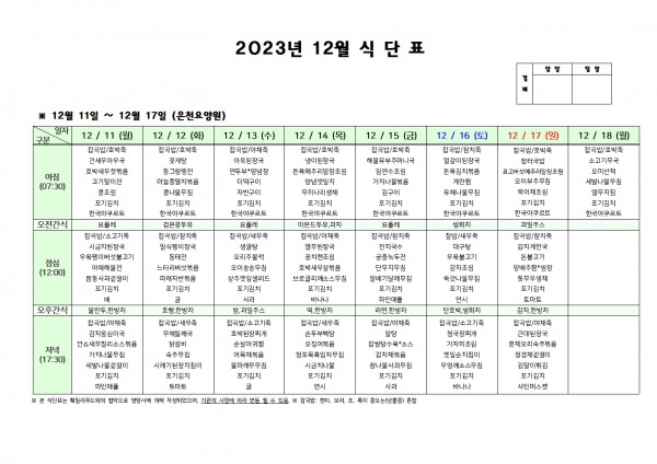 12월 셋째주 식단표 페이지 정보 작성자 은천노인복지회 작성일23-12-08 13:03 조회37,541회 댓글0건 관련링크 이전글 다음글 목록 답변 본문 . 이전글 다음글 목록 답변