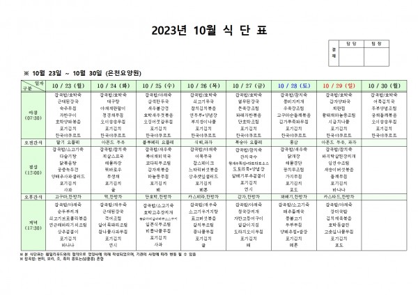 10월 넷째주 식단표 페이지 정보 작성자 은천노인복지회 작성일23-10-19 16:41 조회39,594회 댓글0건 관련링크 이전글 다음글 목록 답변 본문 . 이전글 다음글 목록 답변