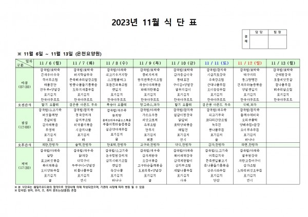 11월 둘째주 식단표 페이지 정보 작성자 은천노인복지회 작성일23-11-02 17:19 조회39,173회 댓글0건 관련링크 이전글 다음글 목록 답변 본문 . 이전글 다음글 목록 답변