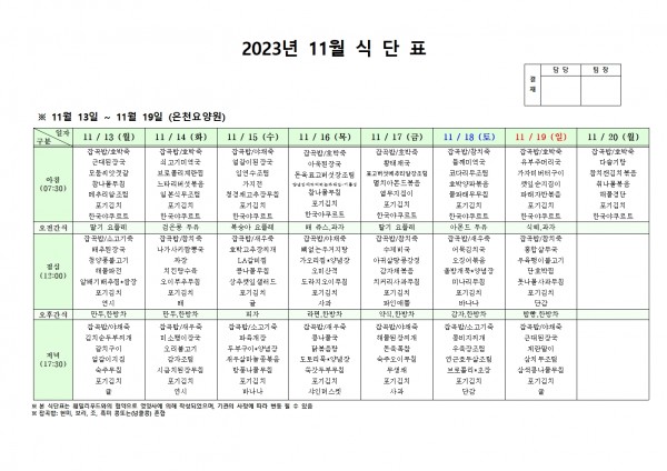 11월 셋째주 식단표 페이지 정보 작성자 은천노인복지회 작성일23-11-10 13:17 조회39,048회 댓글0건 관련링크 이전글 다음글 목록 답변 본문 . 이전글 다음글 목록 답변