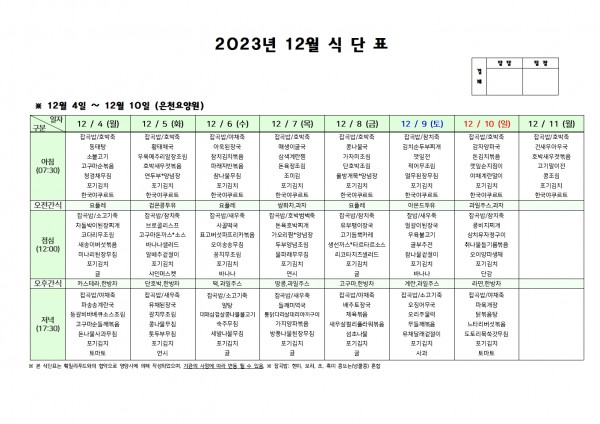 12월 둘째주 식단표 페이지 정보 작성자 은천노인복지회 작성일23-12-01 16:35 조회35,023회 댓글0건 관련링크 이전글 다음글 목록 답변 본문 . 이전글 다음글 목록 답변