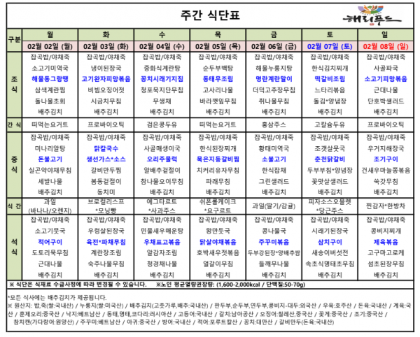 2월 첫째주 식단표 페이지 정보 작성자 은천노인복지회 작성일26-02-04 11:48 조회4,500회 댓글0건 관련링크 이전글 다음글 목록 답변 본문 2월 첫째주 어르신 식단표 안내해 드립니다. 정성과 영양을 담아 준비하겠습니다. 이전글 다음글 목록 답변
