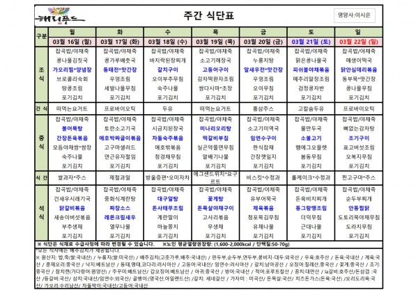 3월 셋째주 식단표 페이지 정보 작성자 은천노인복지회 작성일26-03-13 15:20 조회2,052회 댓글0건 관련링크 이전글 다음글 목록 답변 본문 3월 셋째주 어르신 식단표 안내해 드립니다. 정성과 영양을 담아 준비하겠습니다. 이전글 다음글 목록 답변