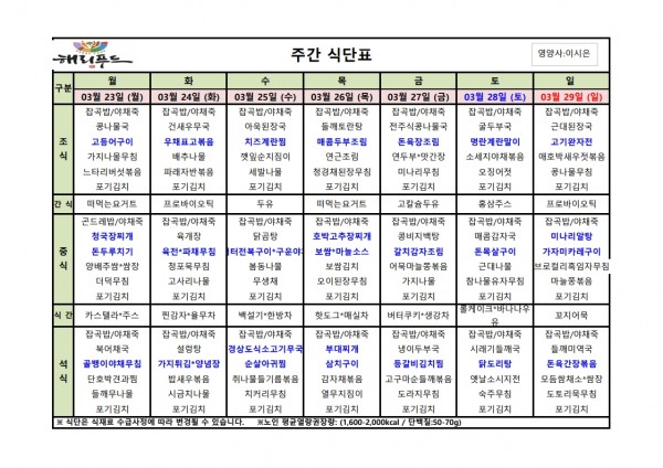 3월 넷째주 식단표 페이지 정보 작성자 은천노인복지회 작성일26-03-20 16:40 조회804회 댓글0건 관련링크 이전글 다음글 목록 답변 본문 3월 넷째주 어르신 식단표 안내해 드립니다. 정성과 영양을 담아 준비하겠습니다. 이전글 다음글 목록 답변