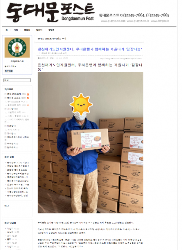 동대문포스트 김장기사 페이지 정보 작성자 은천노인복지회 작성일21-12-29 17:25 조회9,355회 댓글0건 관련링크 https://blog.daum.net/dongdaemunpost/3480 5546회 연결 목록 답변 본문 동대문포스트에 김장나눔 행사 기사입니다~ 목록 답변