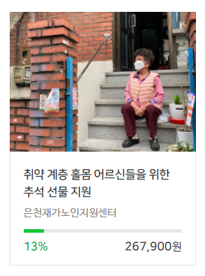 취약계층 어르신을 위한 추석선물 모금활동 페이지 정보 작성자 은천노인복지회 작성일21-08-23 10:22 조회30,150회 댓글0건 관련링크 https://happybean.naver.com/donations/H000000178857 22049회 연결 목록 본문 취약계층 어르신의 추석선물 지원을 위해 해피빈에서 모금활동을 하고 있습니다~ 모금활동에 많은 동참을 부탁드립니다~ 목록