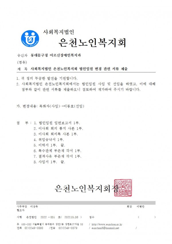 사회복지법인 은천노인복지회 법인 임원 변경 페이지 정보 작성자 은천노인복지회 작성일22-01-06 13:54 조회29,612회 댓글0건 관련링크 목록 본문 사회복지법인 은천노인복지회 법인임원이 아래와 같이 변경되었습니다. 변경내용: 목화자(사임)->이동호(선임) 목록