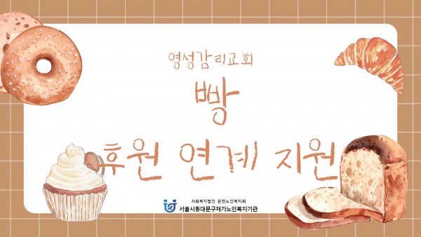 [재가노인지원서비스] 2026년 3월 영성감리교회(빵) 후원 페이지 정보 작성자 은천노인복지회 작성일26-04-06 11:18 조회11회 댓글0건 관련링크 이전글 다음글 목록 답변 본문 기관 인근에 위치한 '영성감리교회'에서 빵(단팥, 소보로, 완두앙금) 200개를 후원해주셨습니다. 이전글 다음글 목록 답변